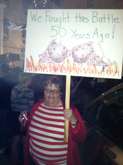 Otherwise, the group was surprisingly diverse. I watched several Gettysburg College students file in, mingled with older locals and families from around the area. I’m told about 750 people actually made it into the ballroom. Outside, people from Occupy Harrisburg turned out. Ron Paul supporters (this is Gettysburg people, he did go to school here) were in full chant mode. The group of older women with burning bras and signs declaring “we fought this war 50 years ago” and “Women Beware” were among my favorites.